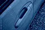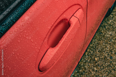Isolated view of a japanese hybrid motor car showing the burn orange coloured door handle and door.