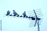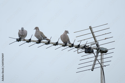 Trio of doves seen resting on a TV antenna which is located on the roof of a house, seen in fairly windy conditions.