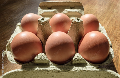 Half a dozen free range chicken eggs seen freshly collected from a small farm, as seen in a generic, cardboard egg box.