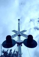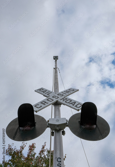 Vertical view of an old-style, US Railroad signalling and crossing sign seen in New England.
