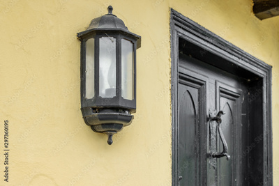 Detailed, shallow focus of a wrought iron door lamp seen at the front of a very old, historic house. The wooden door and antique door knocker are also visible.