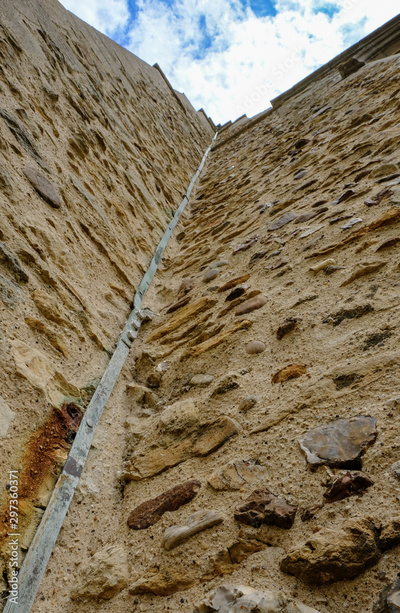 Detailed view of a medieval church showing an installed metal lightning conductor strip.