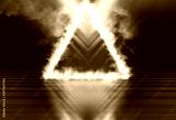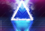 Empty background scene. Dark street reflection on wet asphalt. Neon triangle shape in the dark, smoke. Background of an empty stage show. Abstract dark background.