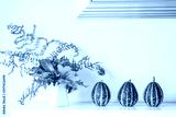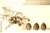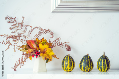 Three decorative striped pumpkins and vase with bouquet of falling leaves and fern on a white chest, table on a background of white wall with mirror. Autumn natural home interior decor. Copy space.