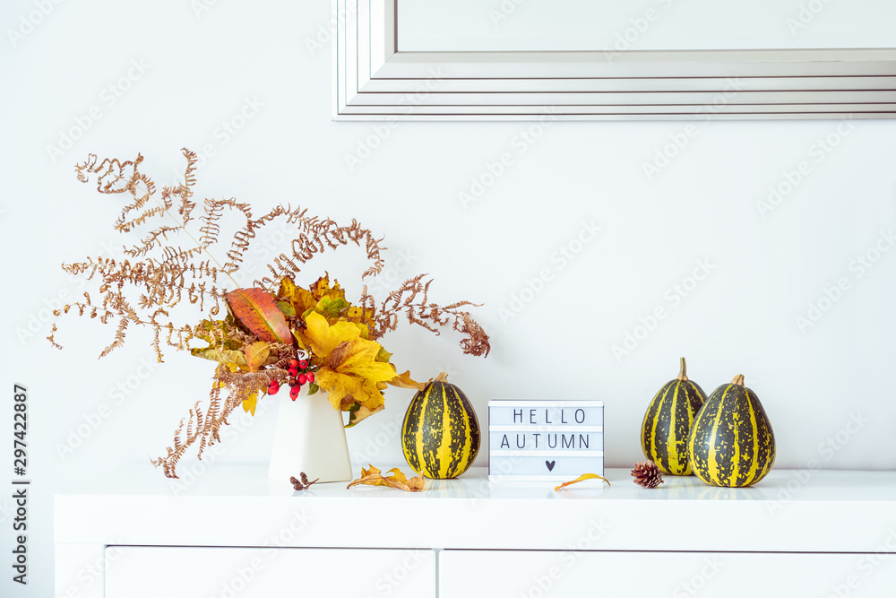 Box with text HELLO AUTUMN, decorative striped pumpkins and vase with bouquet of falling leaves and fern on a white chest, table on a background of wall with mirror. Autumn natural home interior decor