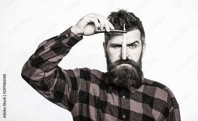 Straight razor, barbershop, beard. Vintage straight razor. Handsome bearded hairdresser in stylish wear is holding a straight razor while standing at the barbershop. Black and white