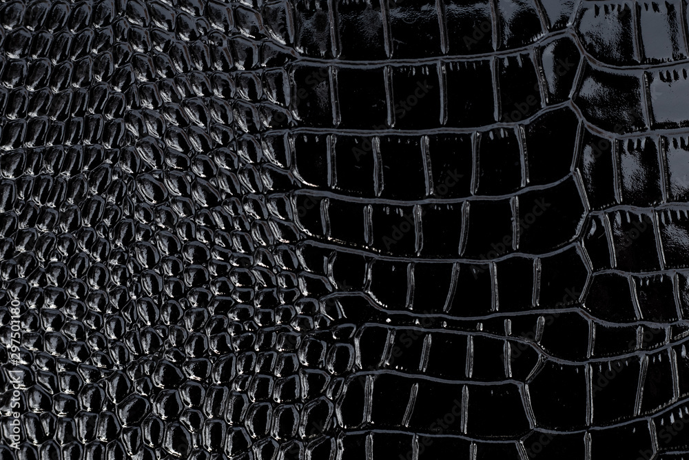 Black patent crocodile leather, background texture. Reptile shiny textile, fabric design.