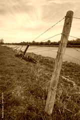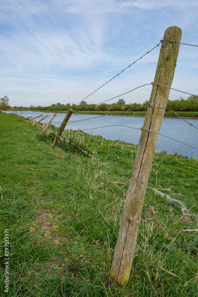 Weathered wooden fence post seen at an angle, holding up a barbed wire fence at the side of a high water river in the English countryside.