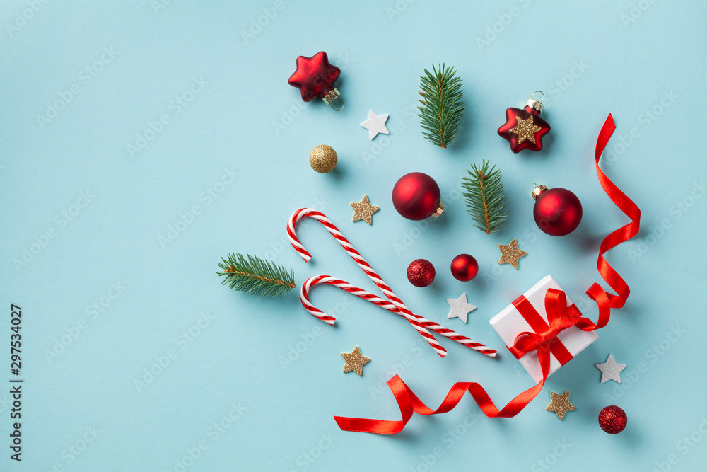 Creative Christmas composition made of gift box and holiday decorations on blue background top view. New Year greeting card. Flat lay.