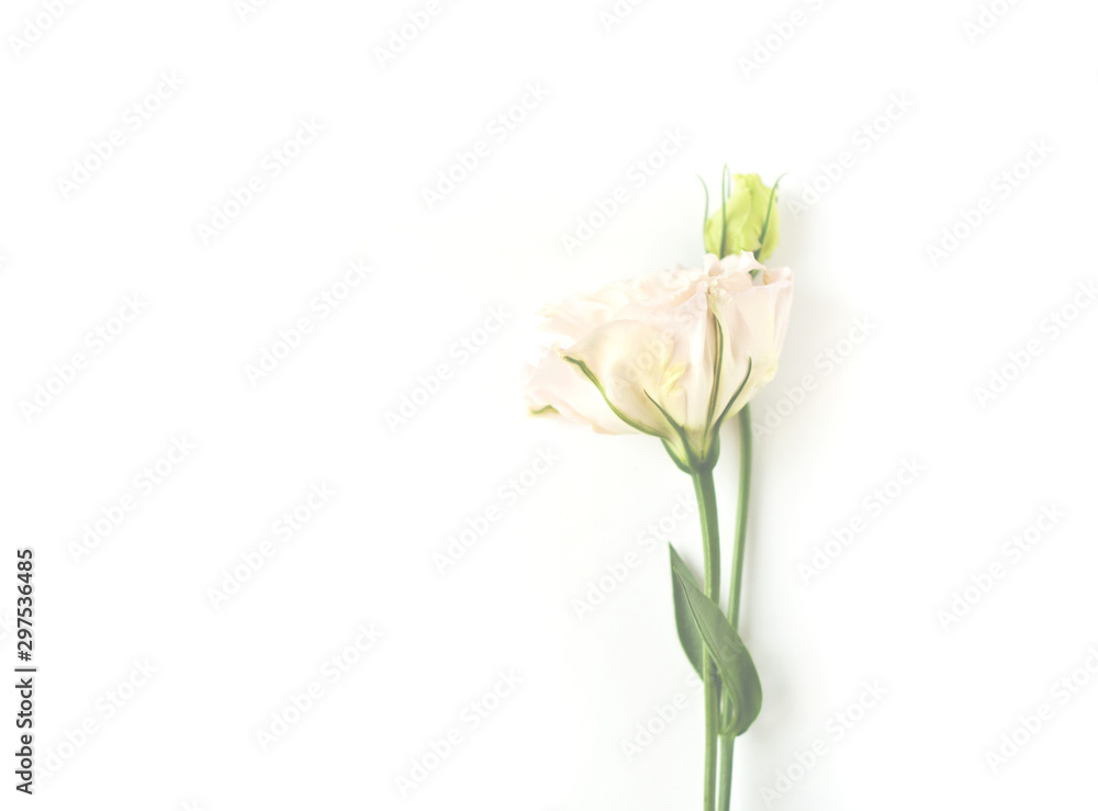 Beautiful white eustoma flower (lisianthus) in full bloom with green leaves.