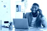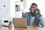 Smiling employee working on laptop and listening music in headphones