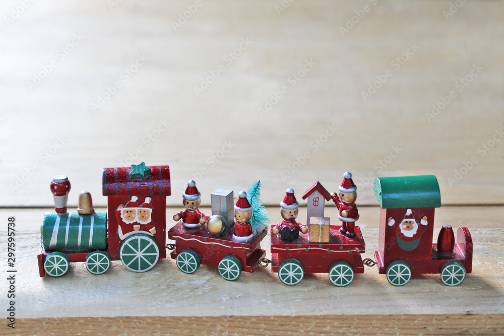 Train de Noël rouge, avec arrière plan bois et espace pour du texte