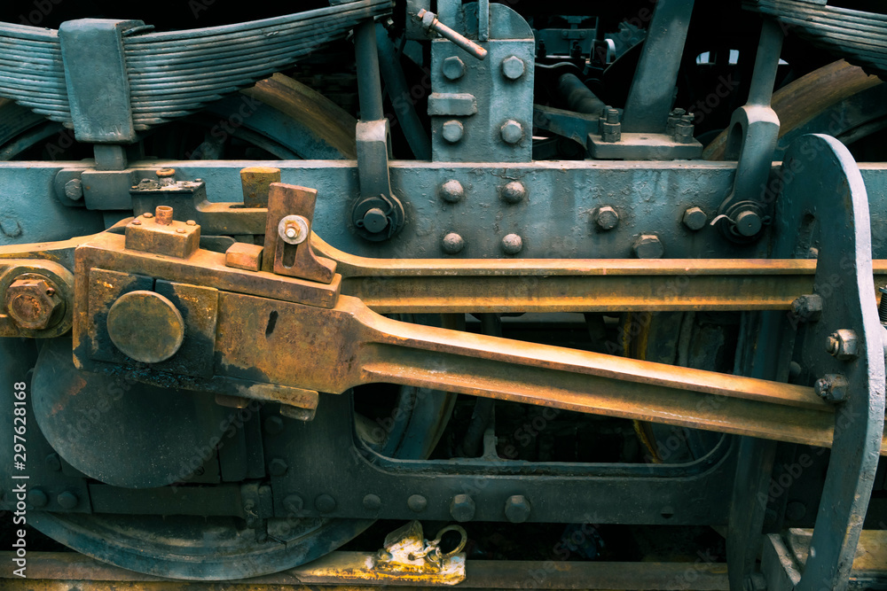 Industrial or transportation or steam punk vintage background with detail of old rusty steam locomotive featuring crank mechanism, frame, wheels and suspension system.
