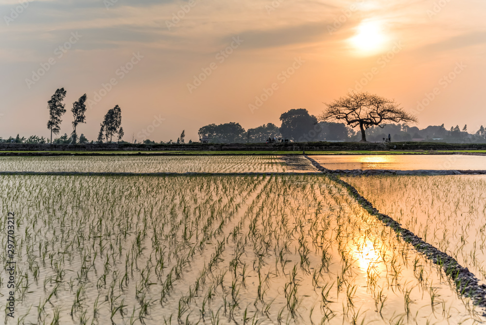 Young rice sprouts ready to growing in the rice field in Hanoi, Vietnam