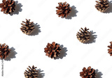 Christmas or New Year concept seamless pattern with pine cones on the white background. Top view