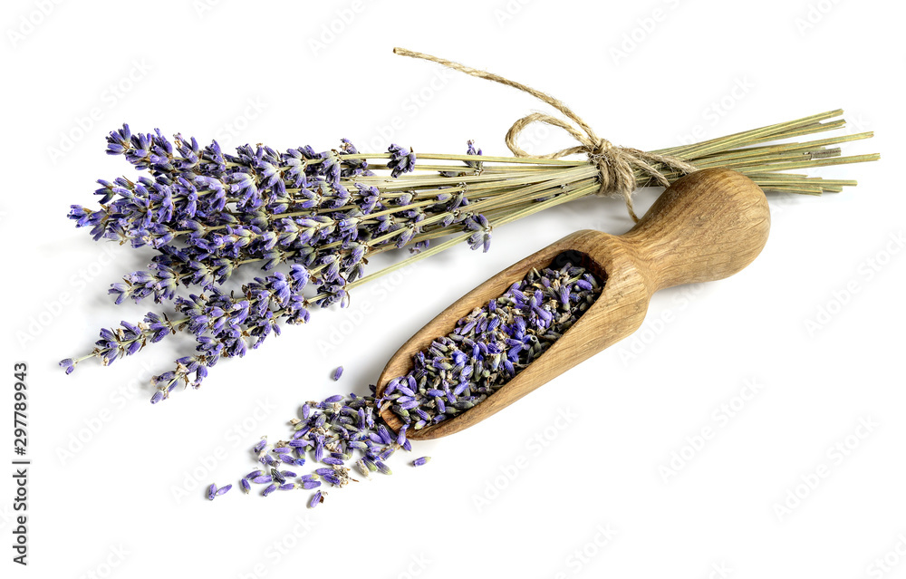 Lavender bunch and wooden scoop with dry flower buds on white background.