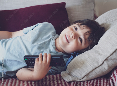 Portrait of happy kid lying on sofa watching TV, Positive child boy holding remote control looking up with smilng face. Relaxing, warm and cozy scene at home
