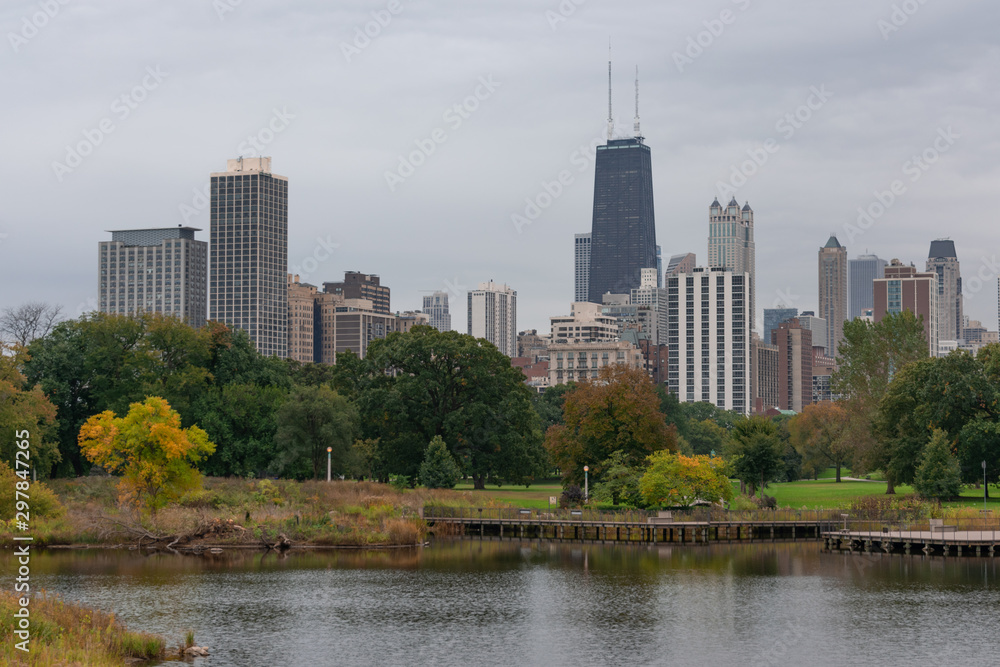 Chicago Skyline and South Pond in Lincoln Park Chicago