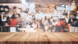 Empty wood table top on blur light bokeh in dark night cafe restaurant background