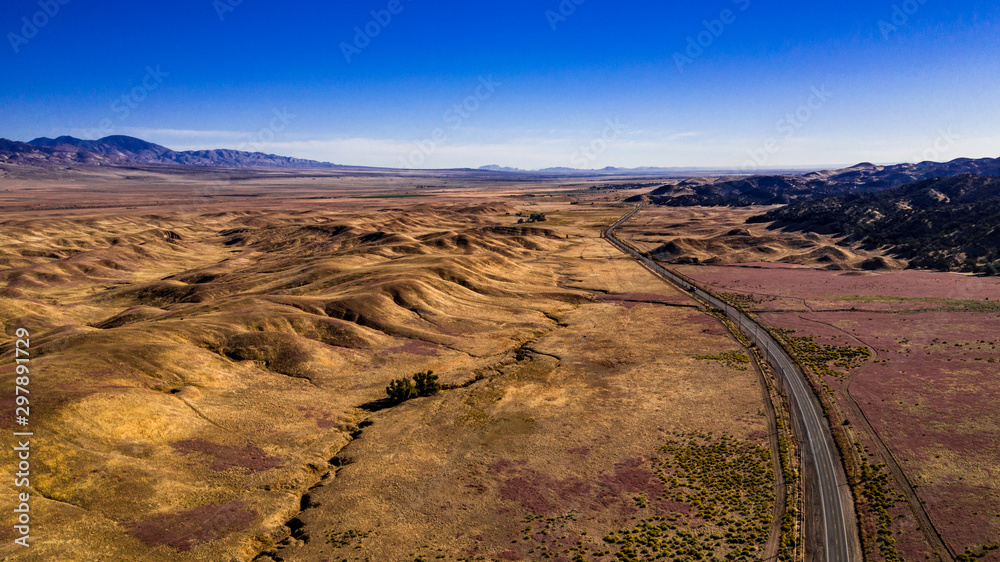 Aerial view of the hills along California Highway 138 near Quail Lake with mauve heather and yellow sagebrush on an Autumn day