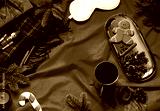 Christmas or New Year concept frame on the red blanket with festive decoration. Top view. Copy space