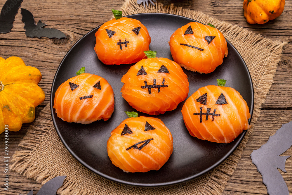 Funny Halloween Sushi Pumpkins Jack o Lantern, Sushi Monsters. Temari sushi, sushi balls. Healthy food for kids