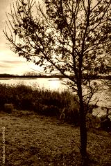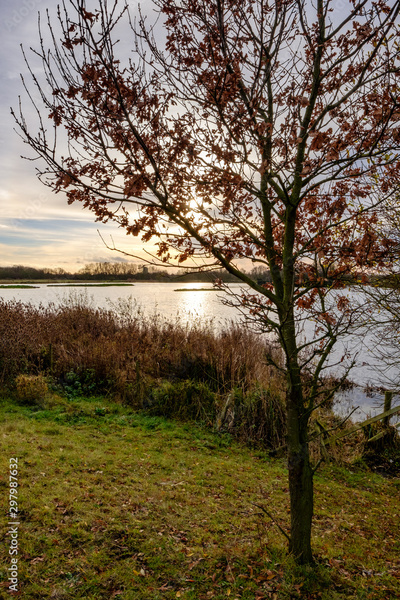 Sun setting low over a large lake at a nature reserve which was formerly a gravel pit.