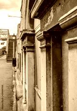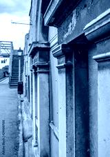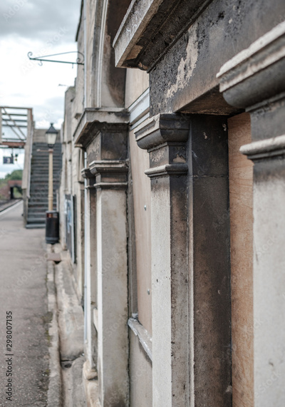 Close-up, architectural view of an victorian railway station, seen on the station platform. The building shows sign smoke blacking and weathering.
