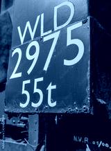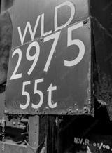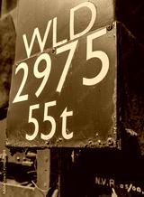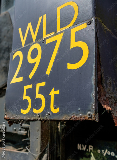 Close-up view of a railway tonnage metal sign seen attached to the side of a freight train. Showing signs of rusting and some decay of the sign.