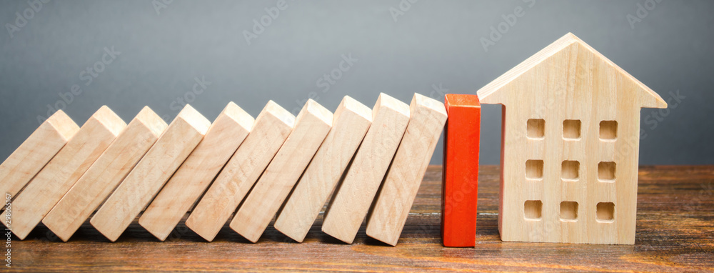 Wooden blocks of dominoes fall on a miniature house. Real estate insurance. Management of risks. Security. Private property protection. Home accident insurance concept