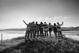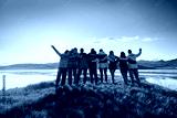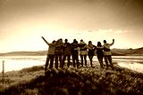 Happy big family hugging together in mountains