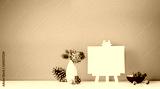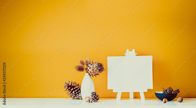 Composition of dried flowers, thorns in light vase, pine cones and blank canvas on a stand on ocher color wall background. Simple, natural home interior decor. Minimalism. Wide banner. Copy space.