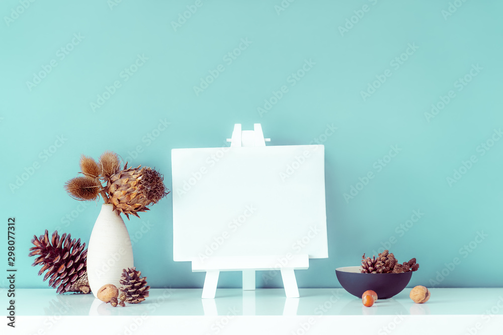 Composition of dried flowers and thorns in light vase, pine cones and empty blank canvas on a stand on turquoise wall background. Eco, natural home interior decor. Simple style. Minimalism. Copy space