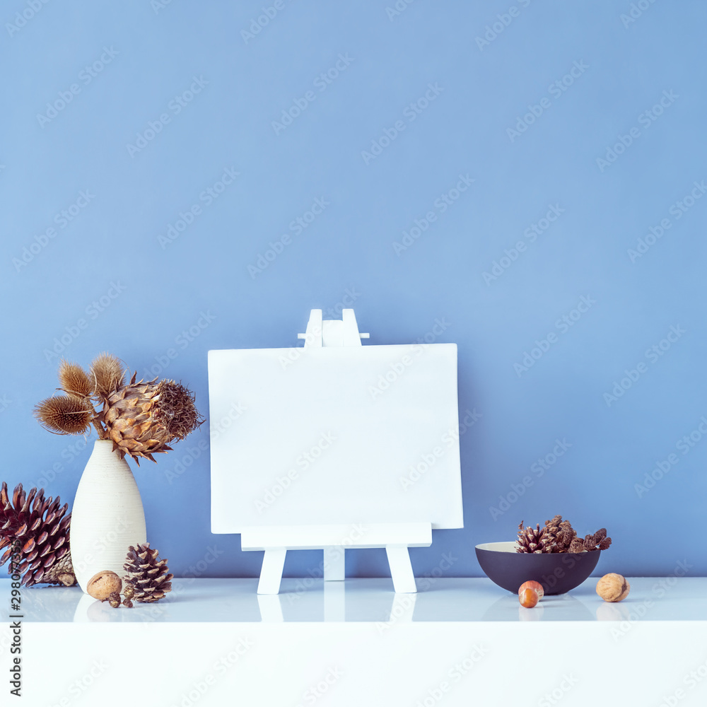Composition of dried flowers and thorns in vase, pine cones and empty blank canvas on stand on blue wall background. Eco, natural home interior decor. Simple style. Minimalism. Square card. Copy space
