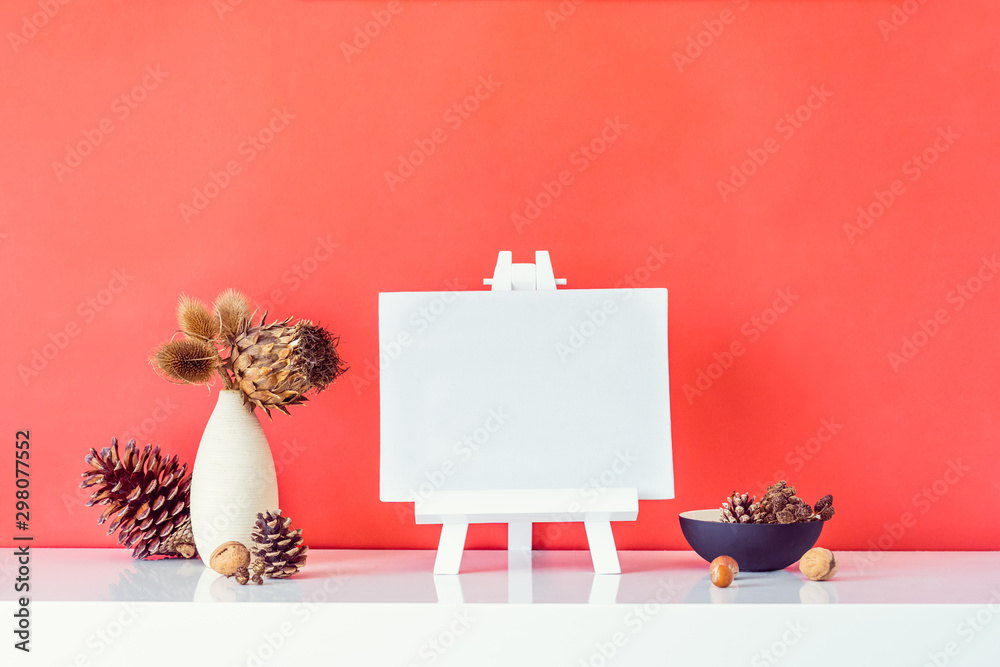 Composition of dried flowers and thorns in light vase, pine cones and empty blank canvas on a stand on red wall background. Eco, natural home interior decor. Simple style. Minimalism. Copy space.