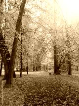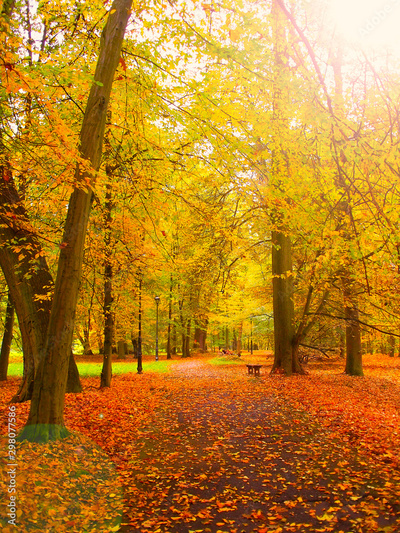 Autumn landscape, falling leaves of the trees in sunlight.