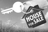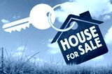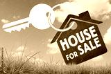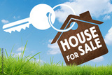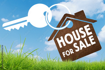 Maison à vendre, panneau en bois, arrière-plan pelouse et ciel bleu