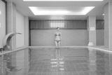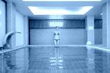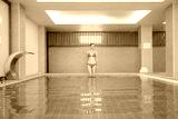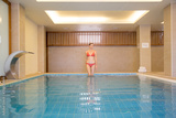 Woman enjoying a day in spa. Woman wearing red swimsuit relaxing at the edge of spa swimming pool.