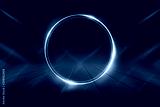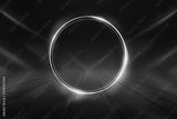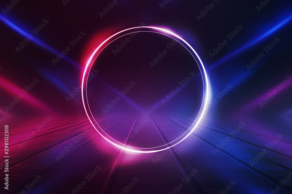 Empty background scene. Dark street reflection on wet asphalt. Rays of neon light in the dark, neon shapes, smoke. Background of an empty stage show. Abstract dark background.