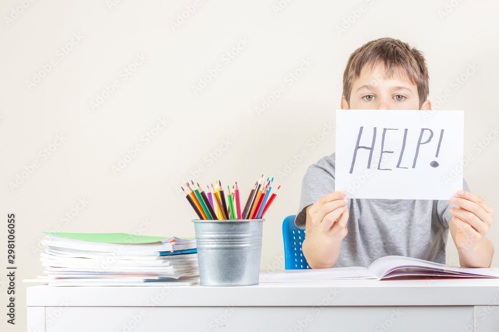Sad tired frustrated boy sitting at the table with many books and holding paper with word Help. Learning difficulties, education concept.