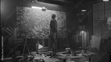Talented Female Artist Works on Abstract Oil Painting, Using Paint Brush She Creates Modern Masterpiece. Dark and Messy Creative Studio where Large Canvas Stands on Easel Illuminated.
