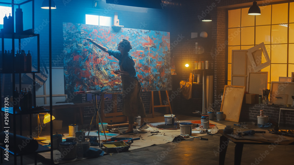 Talented Female Artist Works on Abstract Oil Painting, Using Paint Brush She Creates Modern Masterpiece. Dark and Messy Creative Studio where Large Canvas Stands on Easel Illuminated