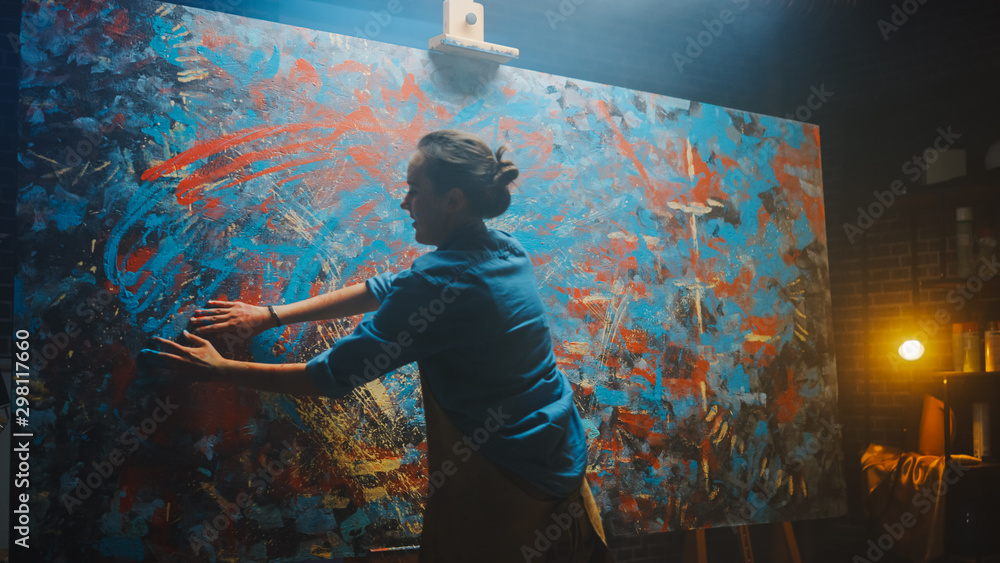 Talented Innovative Female Artist Draws with Her Hands on the Large Canvas, Using Fingers She Creates Colorful, Emotional, Sensual Oil Painting. Contemporary Painter Creating Abstract Modern Art.
