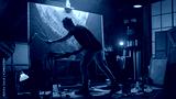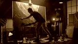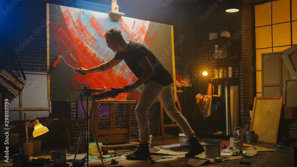 Talented Male Artist Working on a Abstract Painting, Uses Industrial Roller To Create Daringly Emotional Modern Picture. Dark Creative Studio Large Canvas Stands on Easel Illuminated