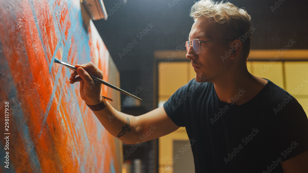 Talented Artist Working on Abstract Painting, Dips Brush in Paint and Starts Drawing Daringly Emotional Modern Art. Dark Creative Studio Large Canvas Stands on Easel Illuminated