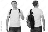 Set of Closeup smiling happy Student in blank template white t shirt with backpack front and back view. Travel man and education concept. Copy space. Mock up
