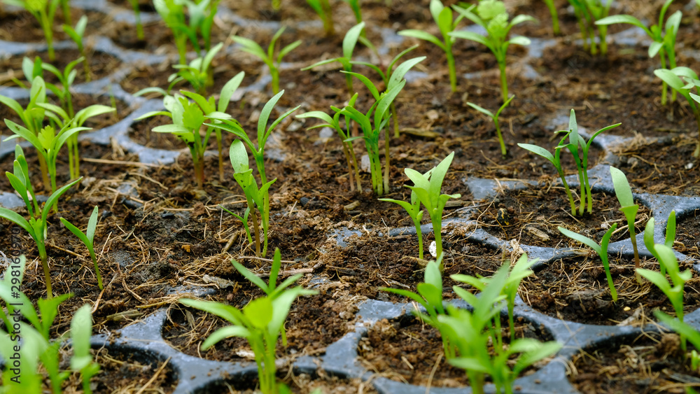 selective Close-up of green seedling, Green salad growing from seed, Organic salad in the garden Plant .