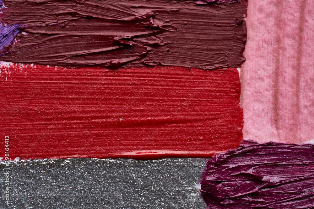 Texture of different lipsticks in fashionable shades or strokes of acrylic paint