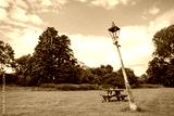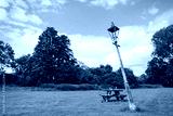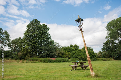 Old, vintage styled electric lamp post seen in a disused and bent position in a large beer garden. A single table is seen together with beer glasses and litter.