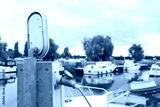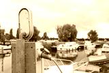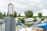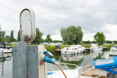 Old and dirty life ring seen hocked over a boating power outlet, seen in an inland harbour. Various boats can be seen moored up, many hired out to tourists.